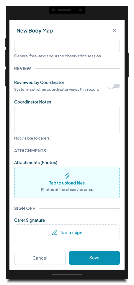Body map observations After completing a skin integrity check or body map, the carer signs to confirm the observations are accurate and complete. This creates a clear chain of custody for clinical documentation.