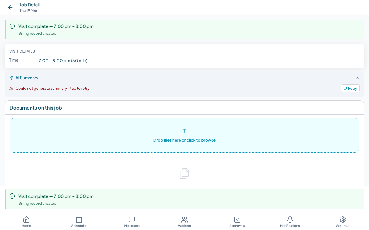 !Job detail screen in CareOS showing visit time, AI Summary section, and Documents on this job