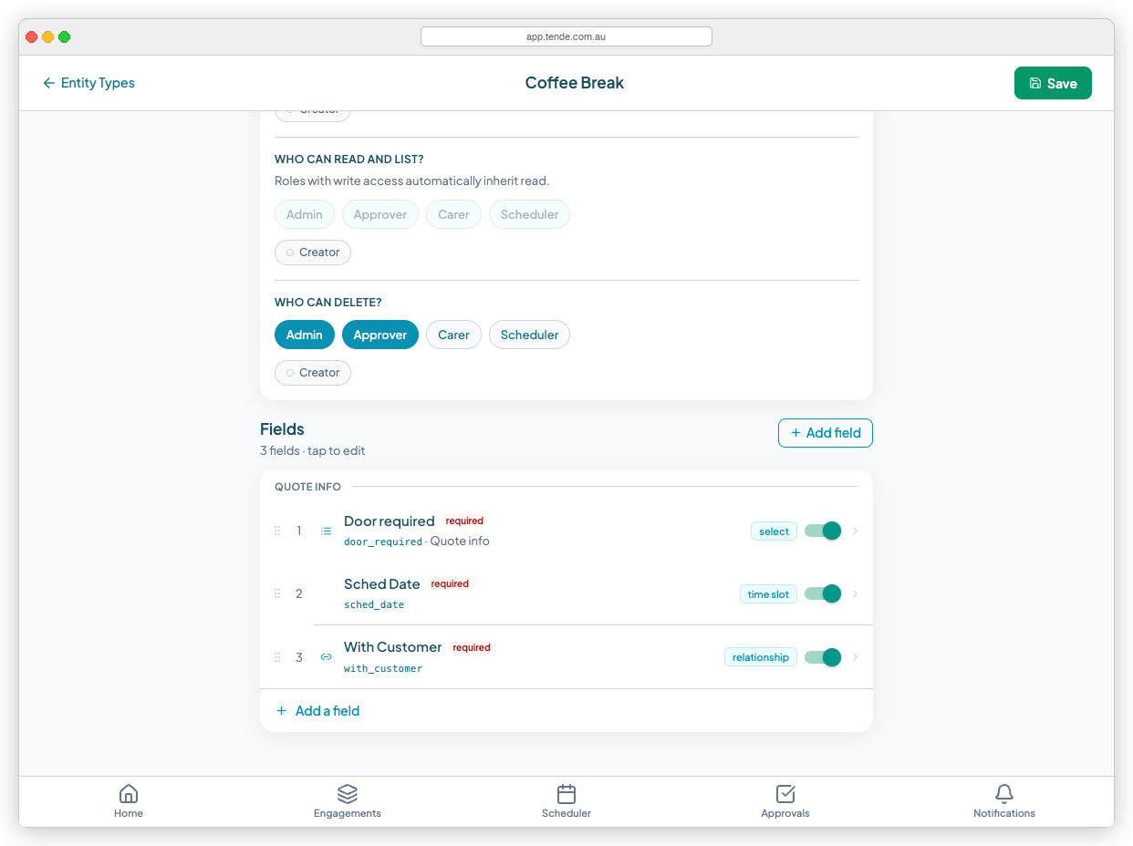 Every custom entity type in Teiro has its own access controls. These let you decide precisely who can create records, who can view them, and who can delete them — down to a specific role if needed.