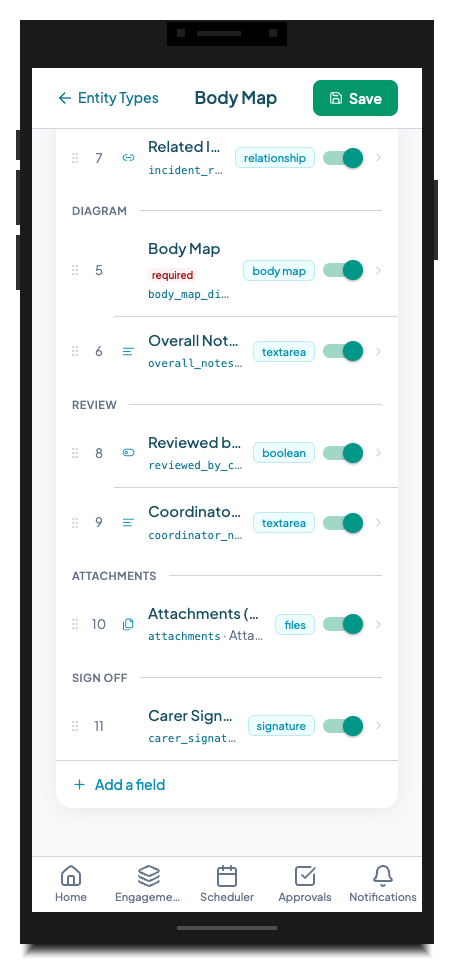 Incident reports Incident reports often require sign-off from both the carer who observed the incident and a supervisor or coordinator who reviewed it. Two separate signature fields — one carer-facing, one coordinator-facing — handle this cleanly. You can set field visibility and editability per role in the entity type access settings.