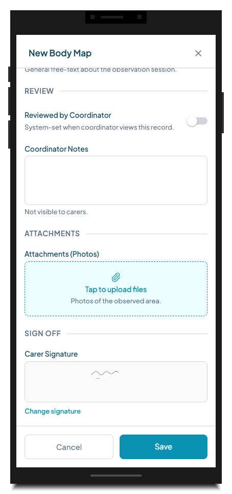 Body map observations After completing a skin integrity check or body map, the carer signs to confirm the observations are accurate and complete. This creates a clear chain of custody for clinical documentation.